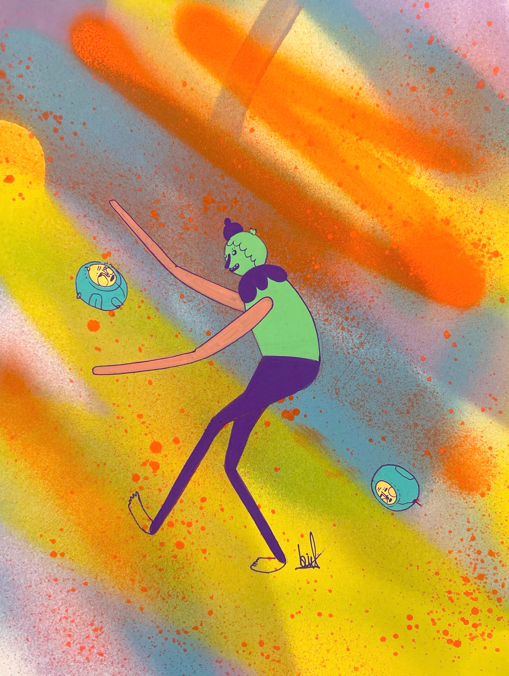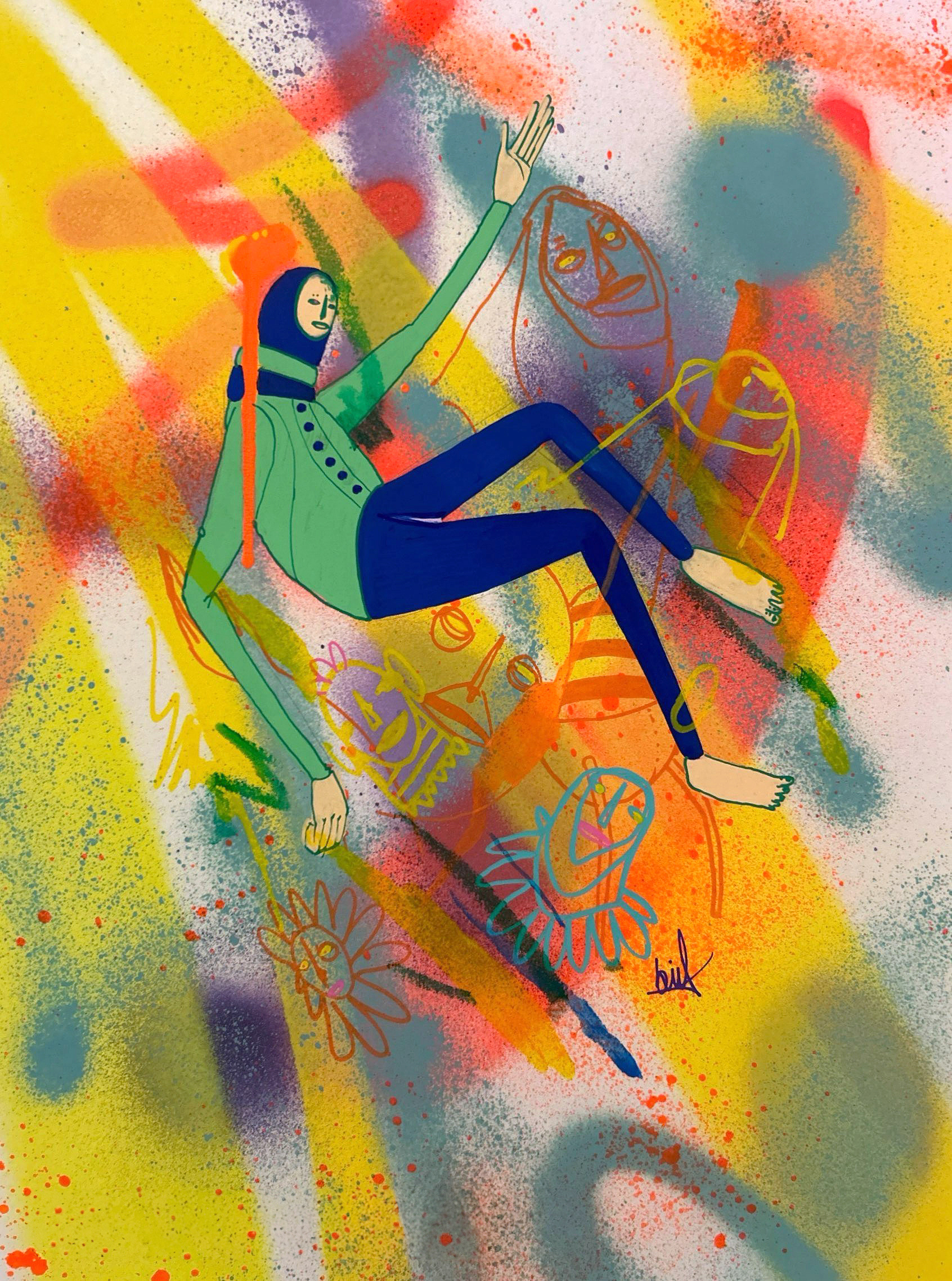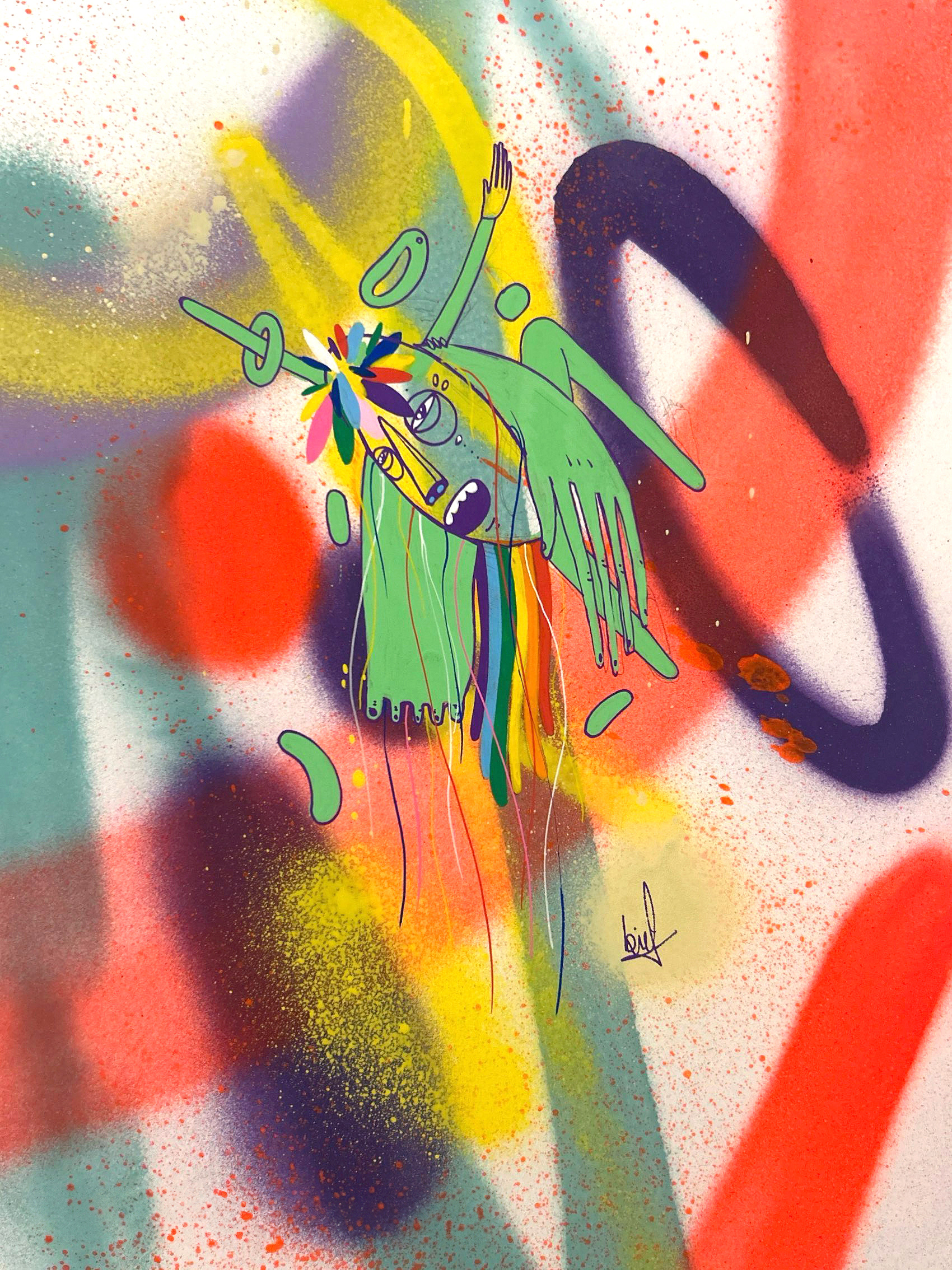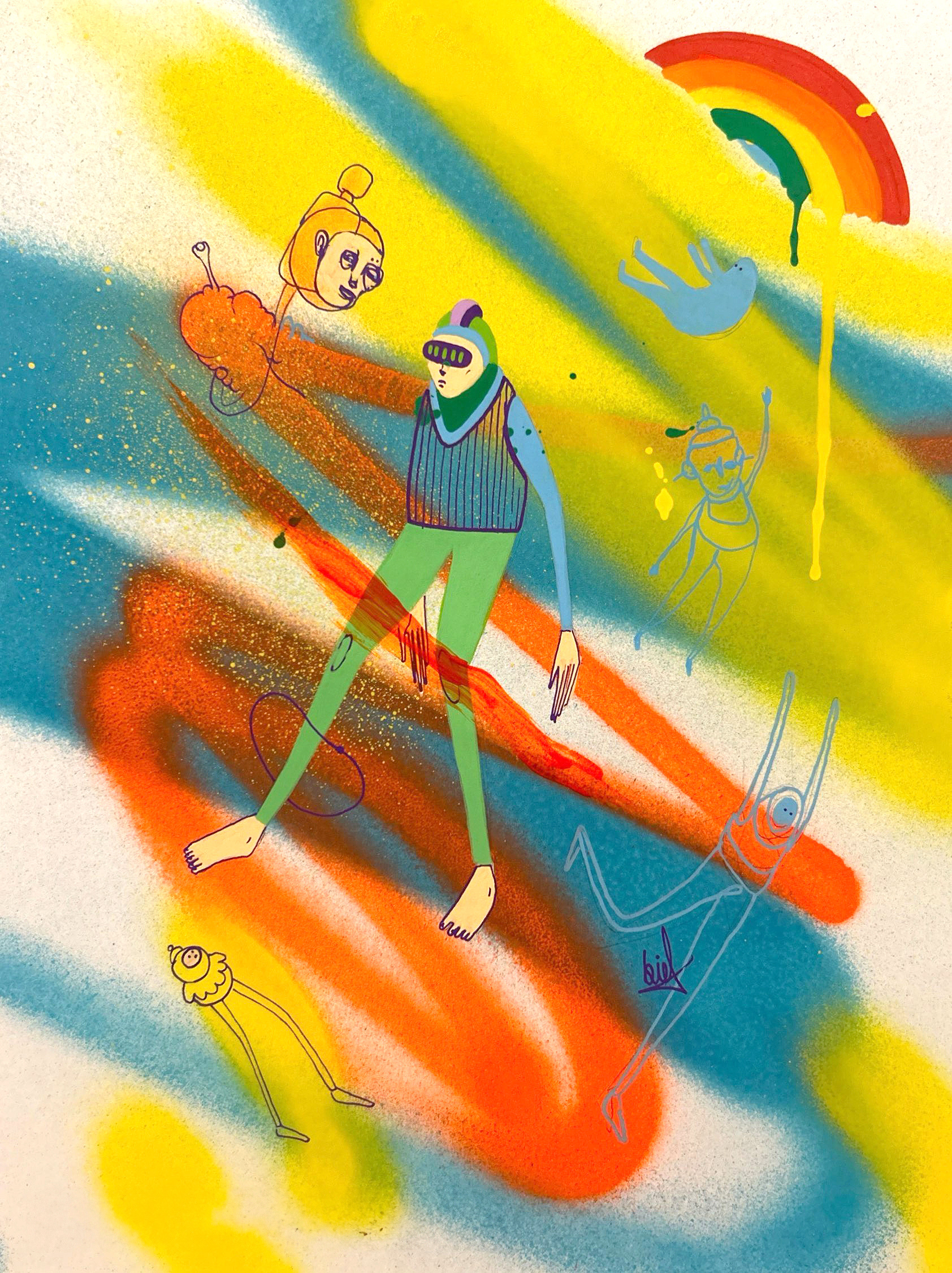 Spray paint, acrylic and marker on paper.