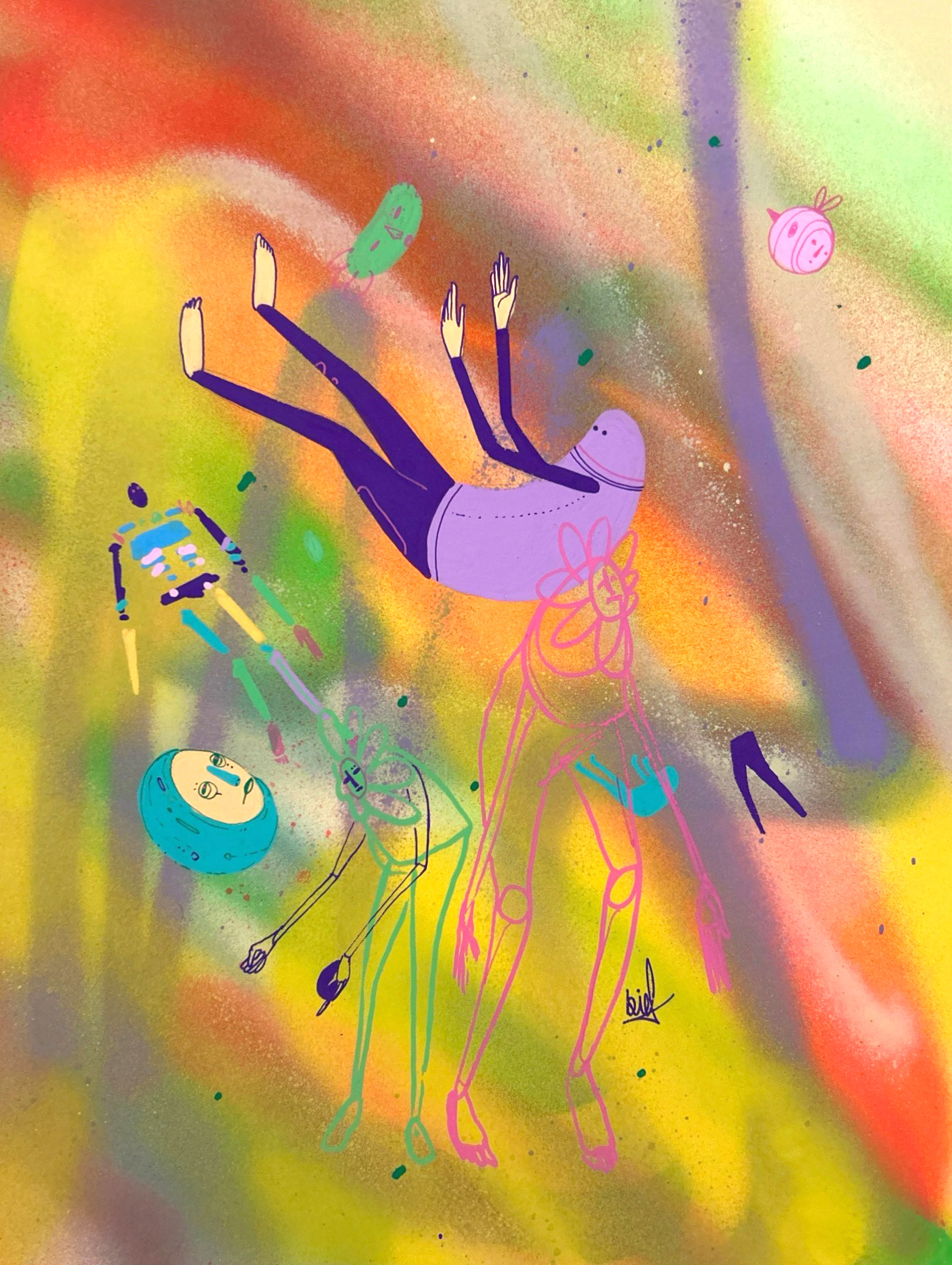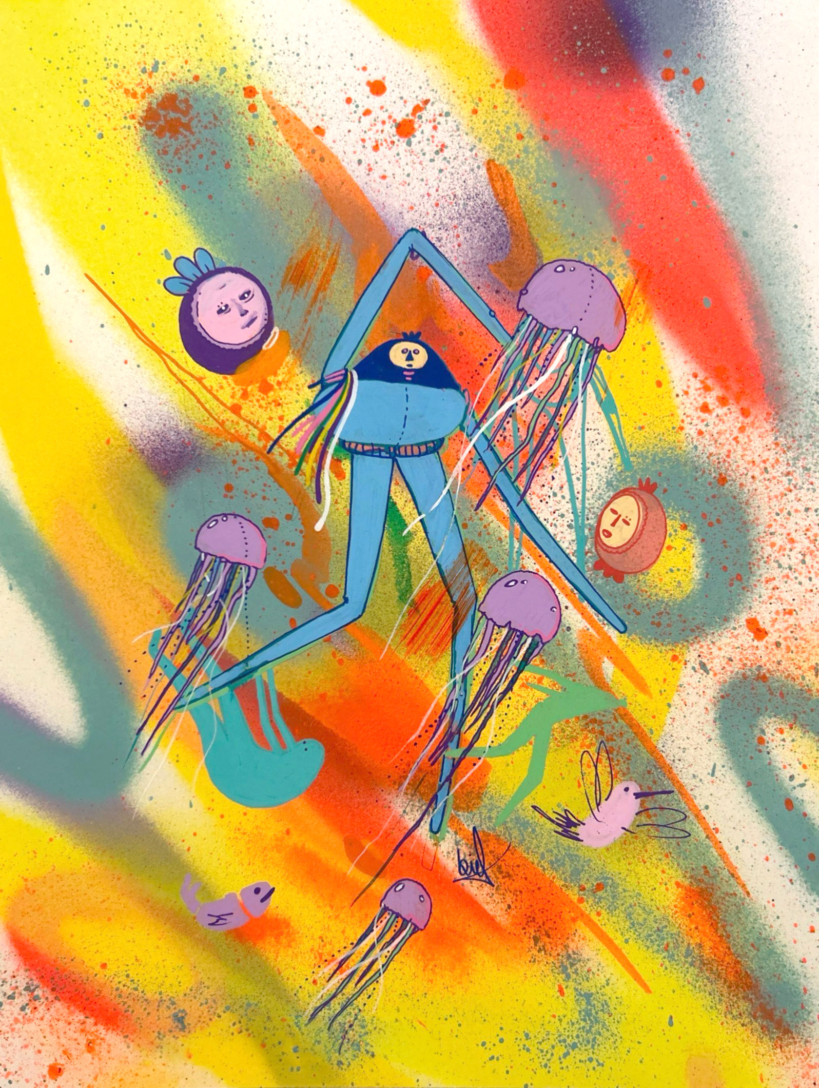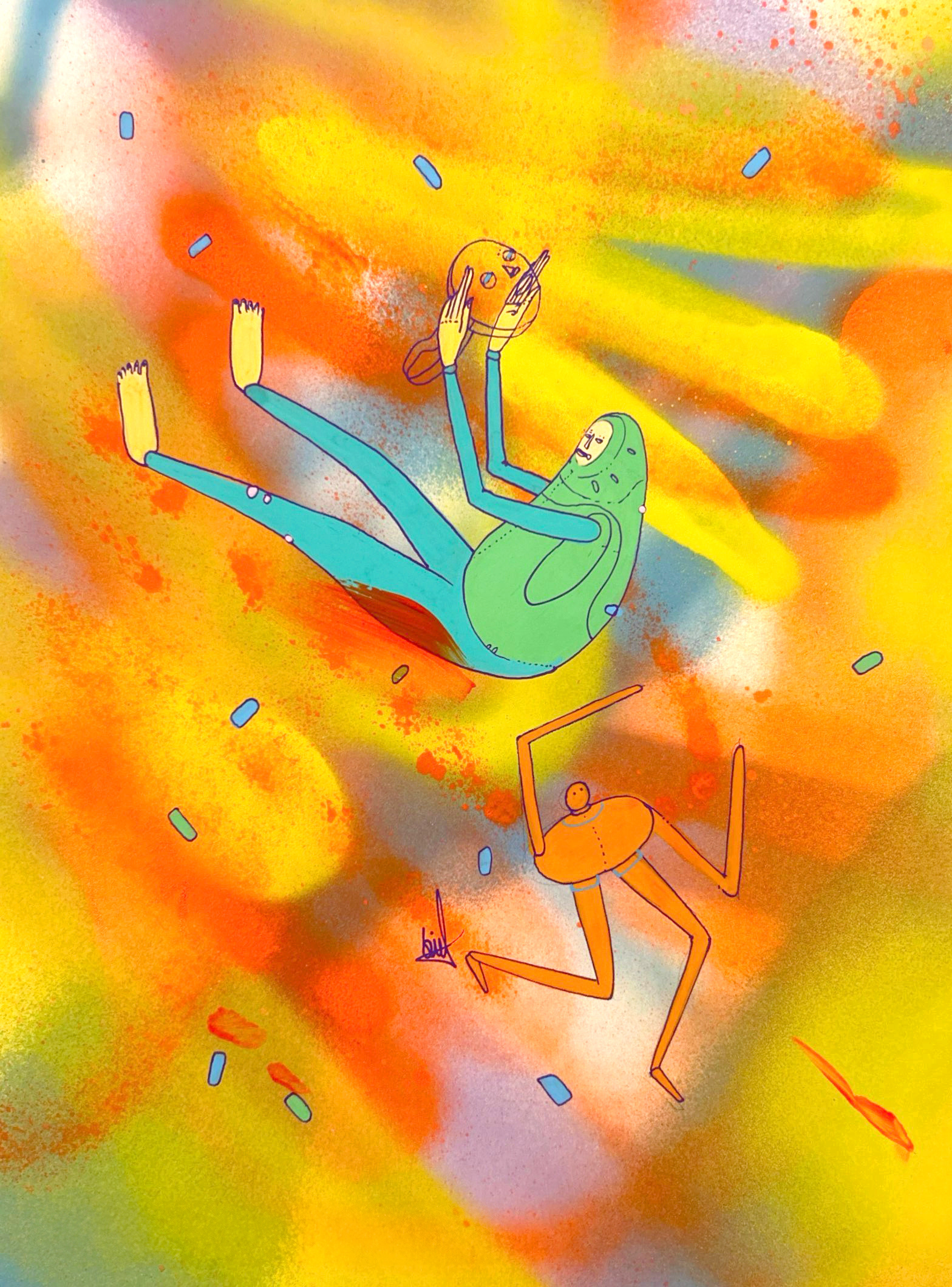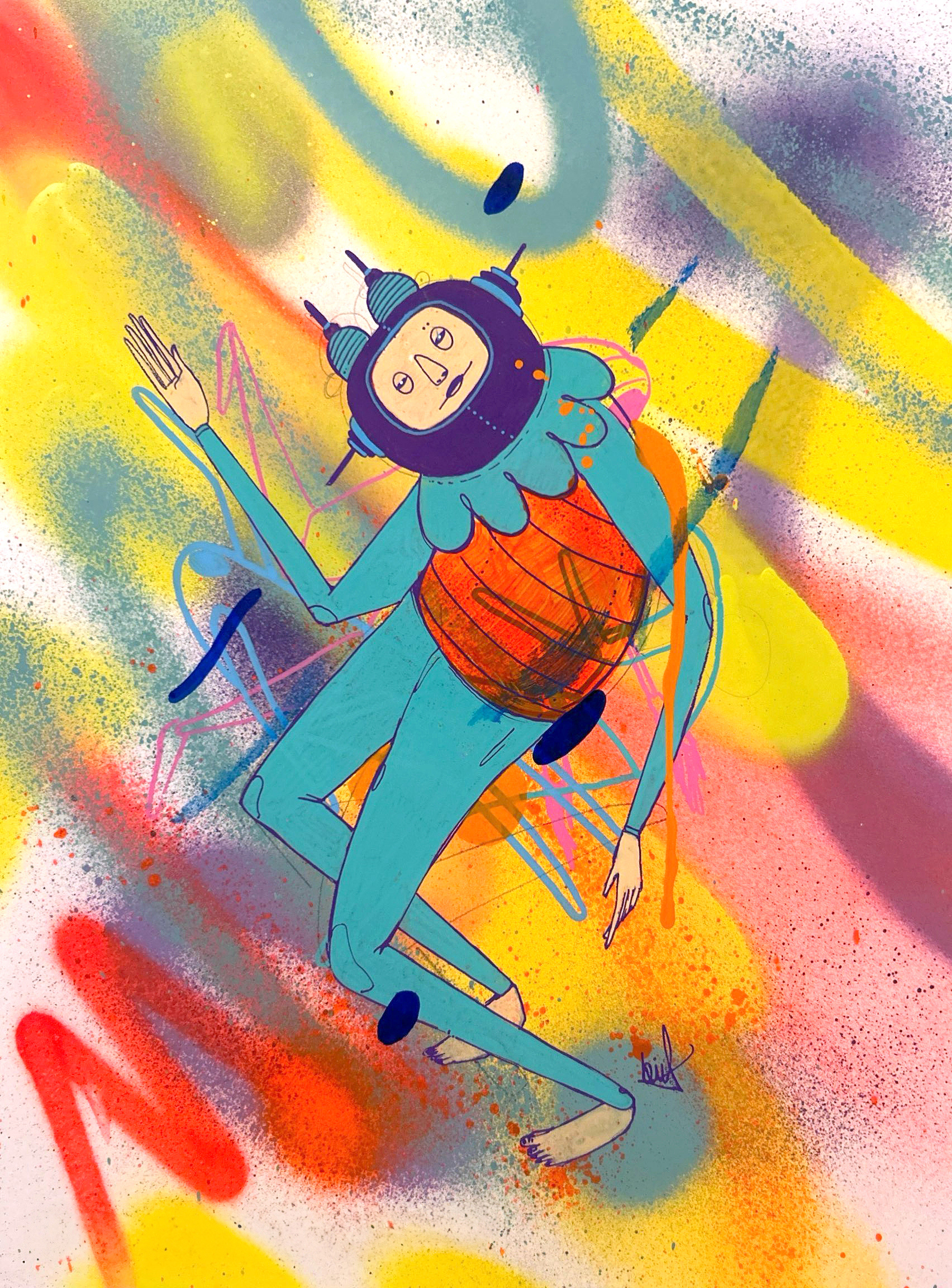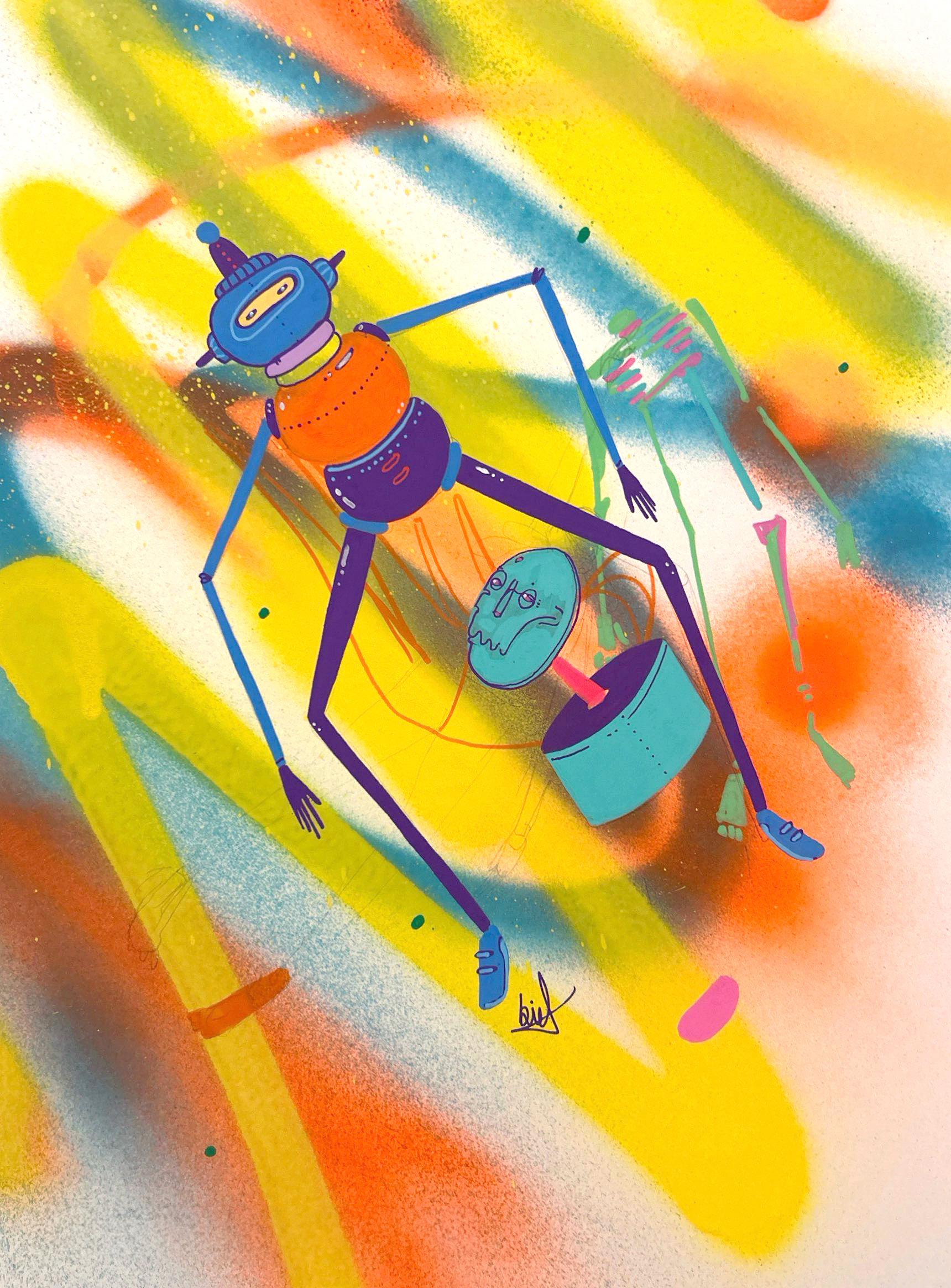 Spray paint, acrylic and marker on paper.