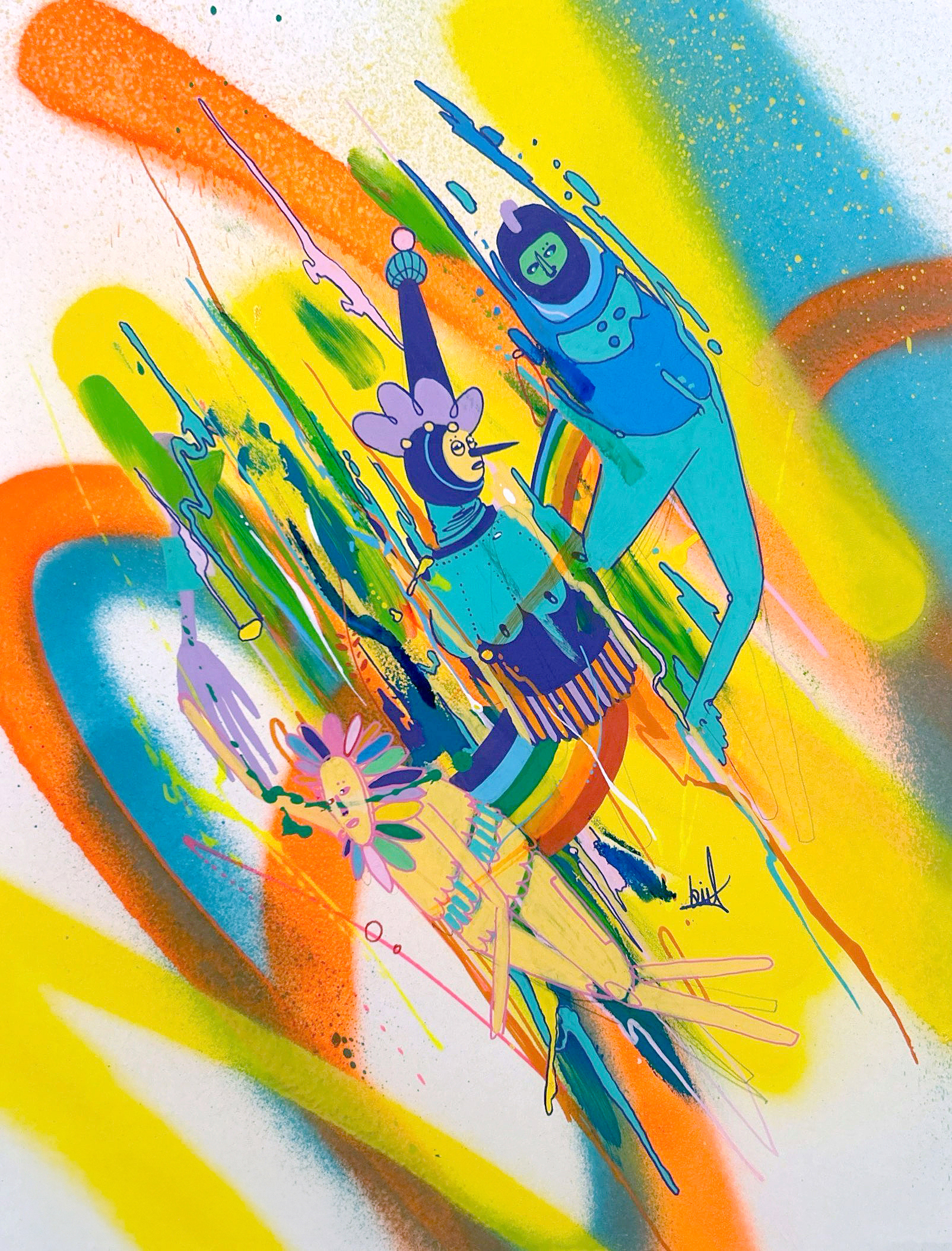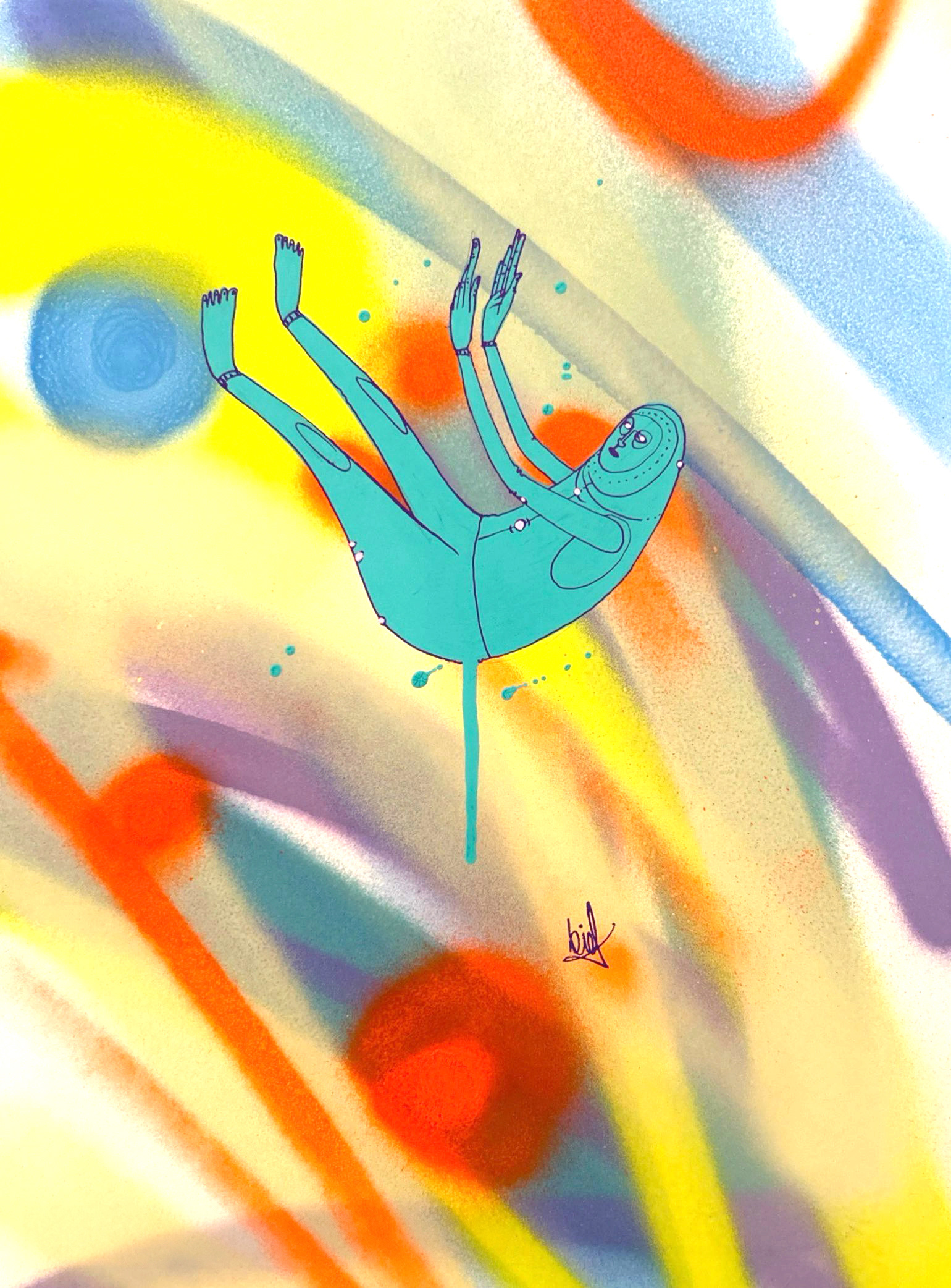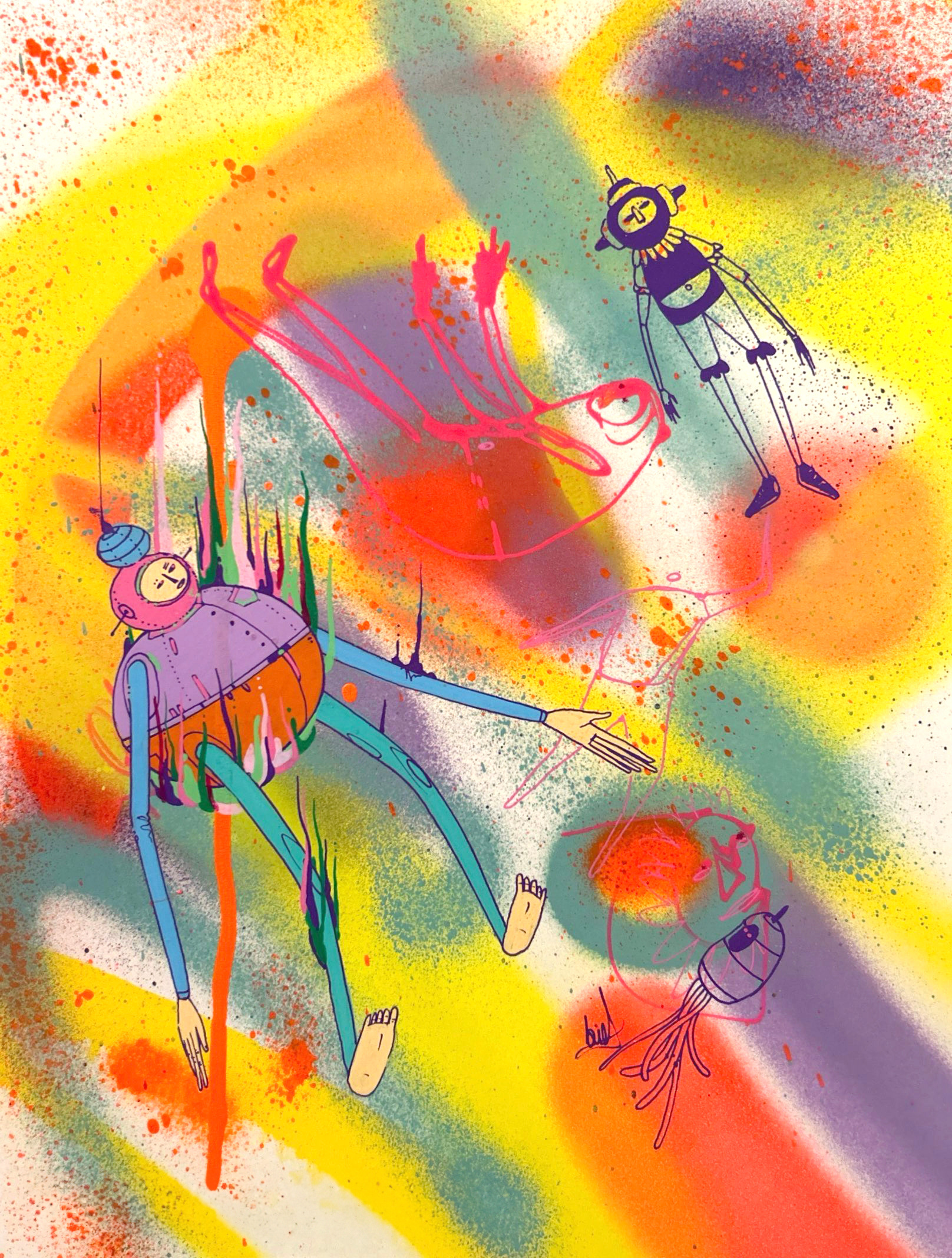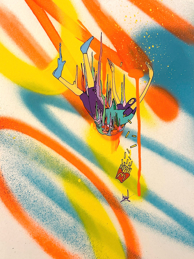 Spray paint, acrylic and marker on paper.