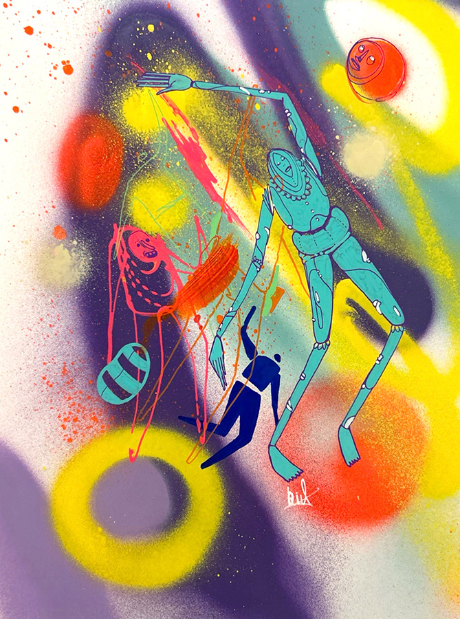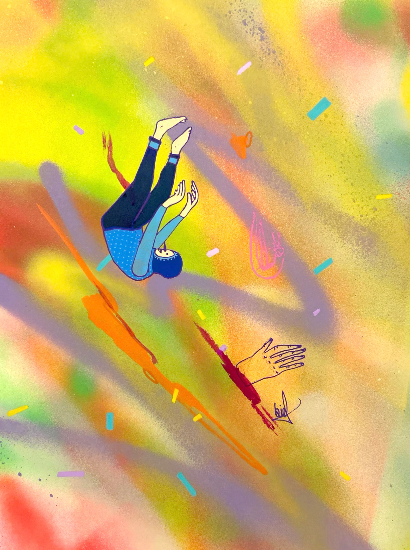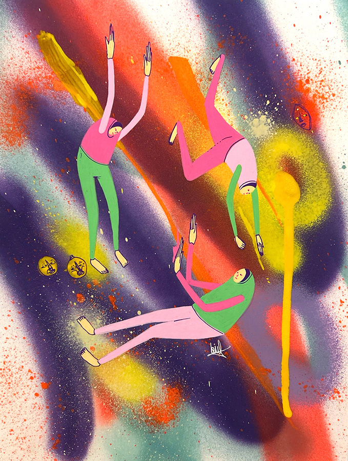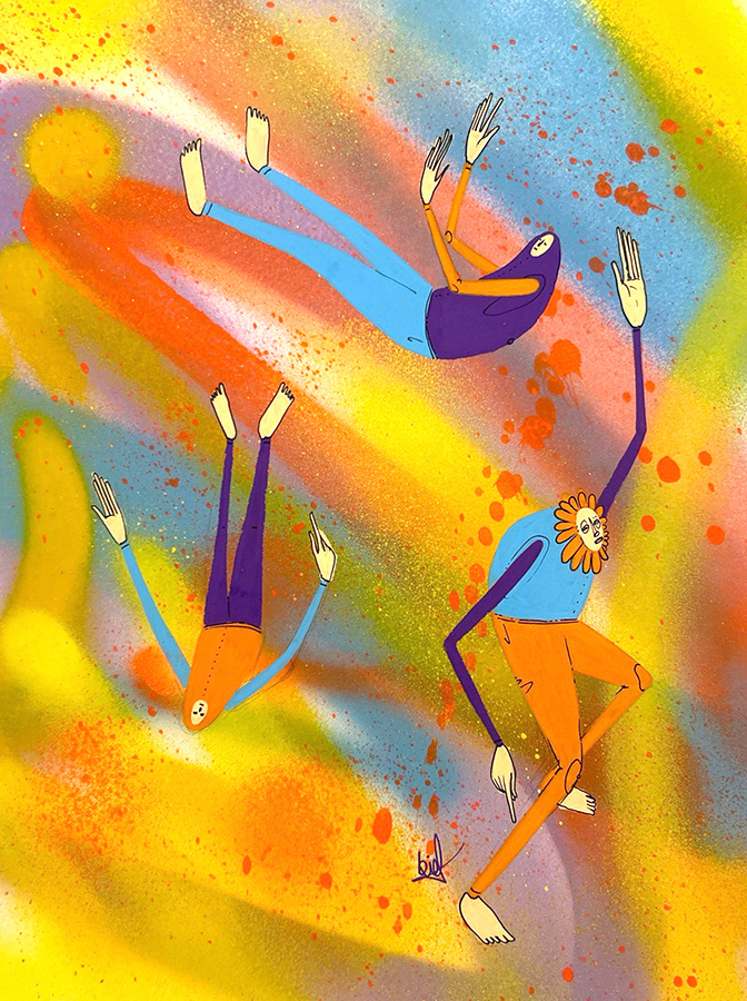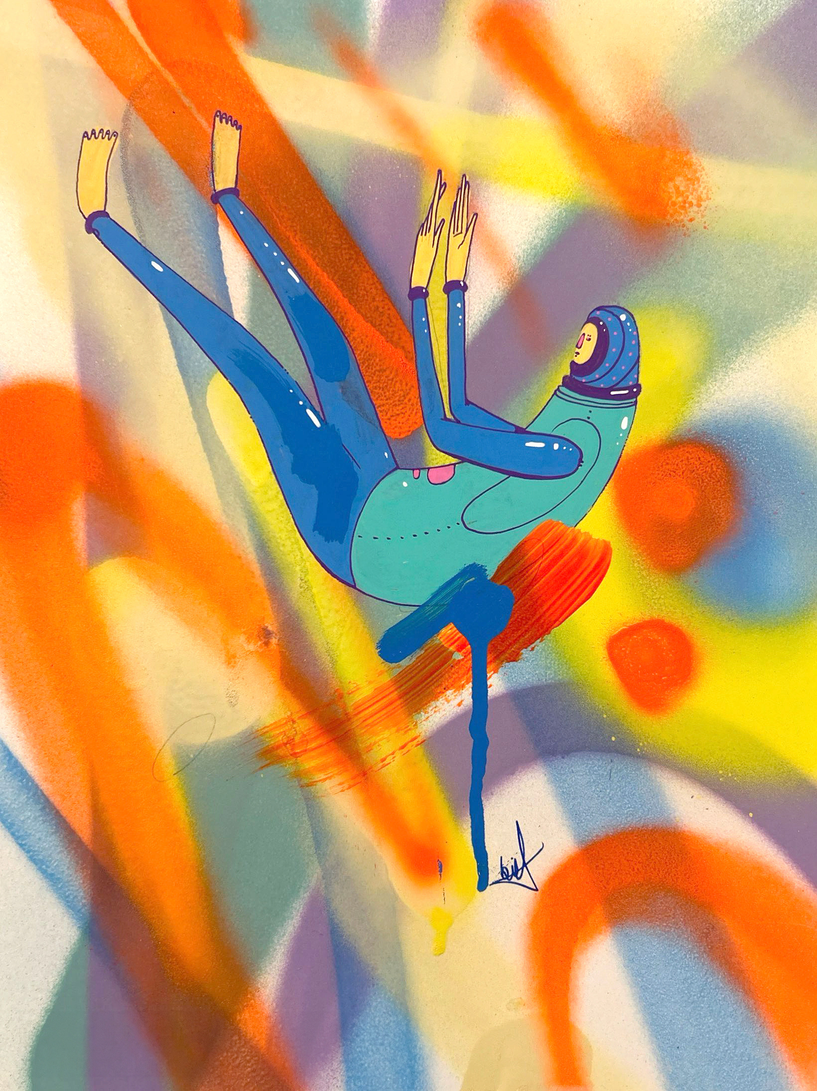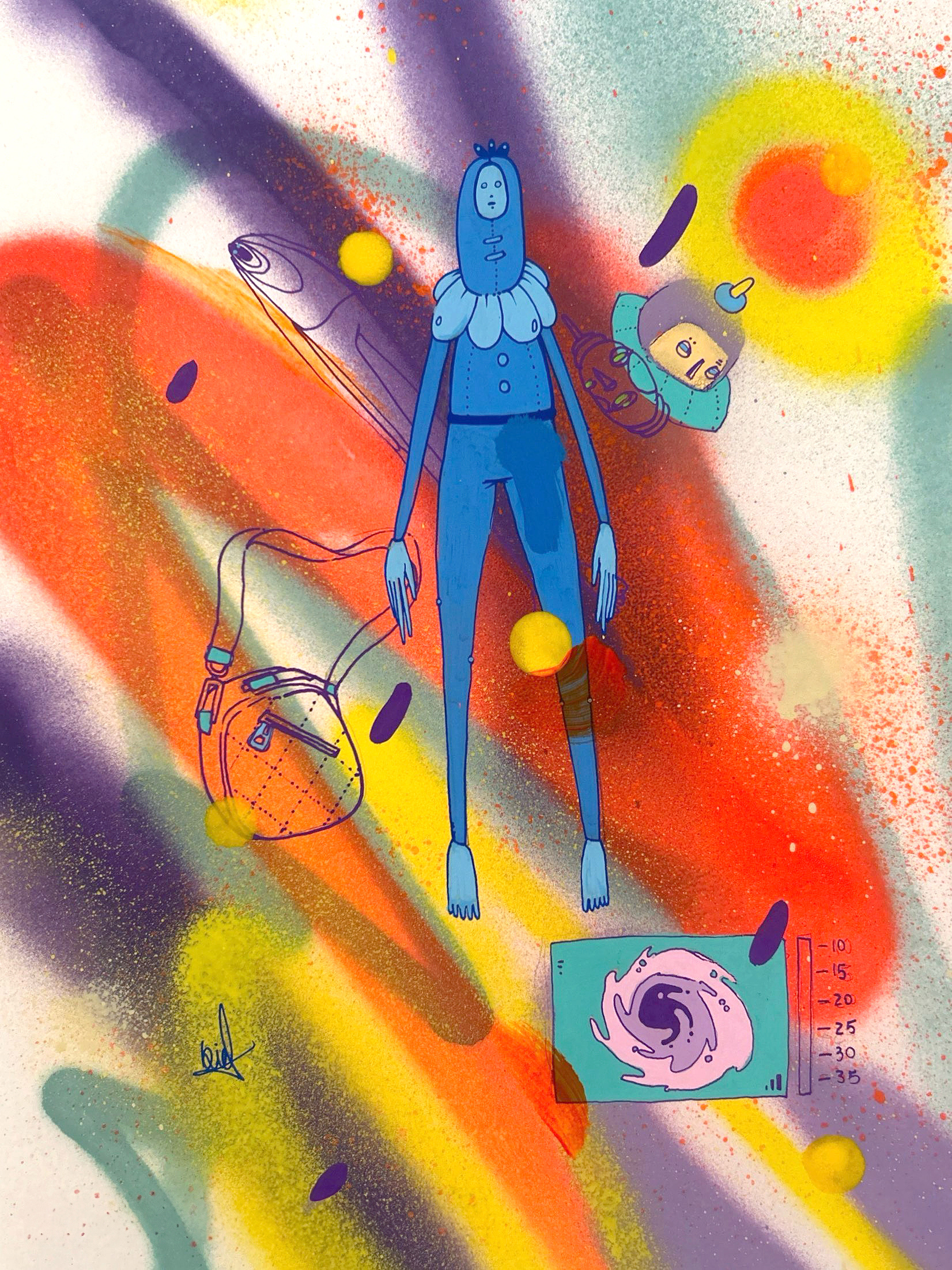 Spray paint, acrylic and marker on paper.